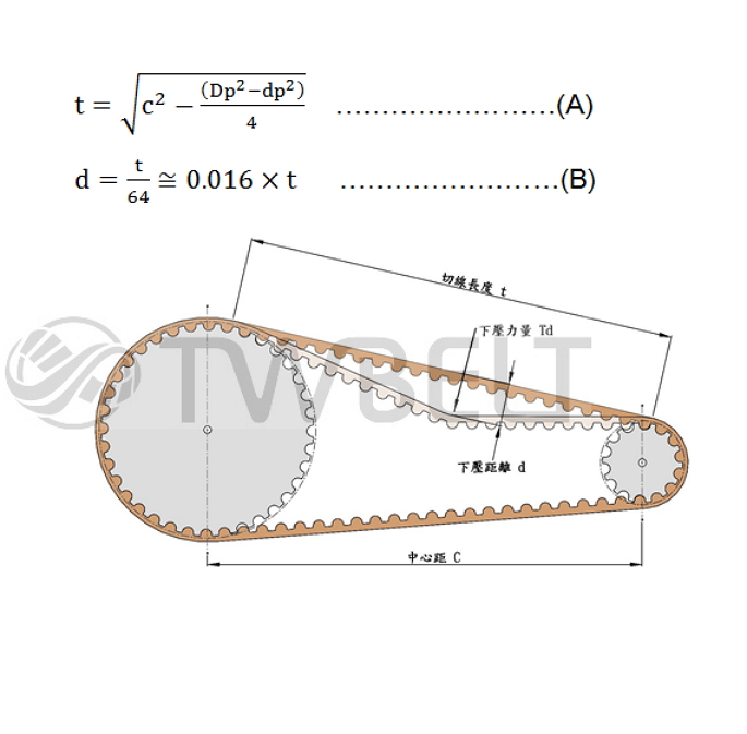 將二側皮帶輪固定不動,在切線長度(t)的中央施加一和皮帶面垂直的下壓力量(Td),壓下的距離一般為切線長度(t)的1/64,下壓力量請依下表皮帶種類與寬度選取,切線長度(t)由公式A求得。